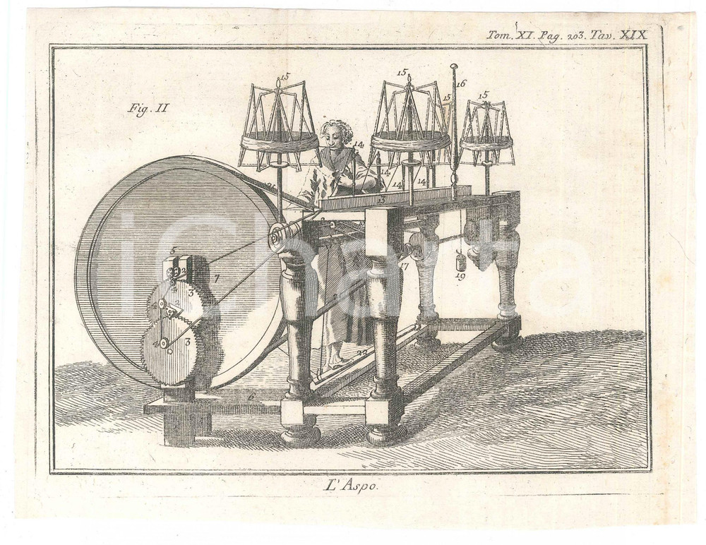 Stampa originale d'epoca, proveniente dall'opera "Lo spettacolo della natura" di Nöel Antoine Pluche, tomo XI, tav. XIX.Titolo : "L'aspo".Si tratta, molto probabilmente, dell'edizione del 1767 di Vincenzo Manfredi, Napoli. CONDIZIONI:GOOD/buono piegature d'epoca