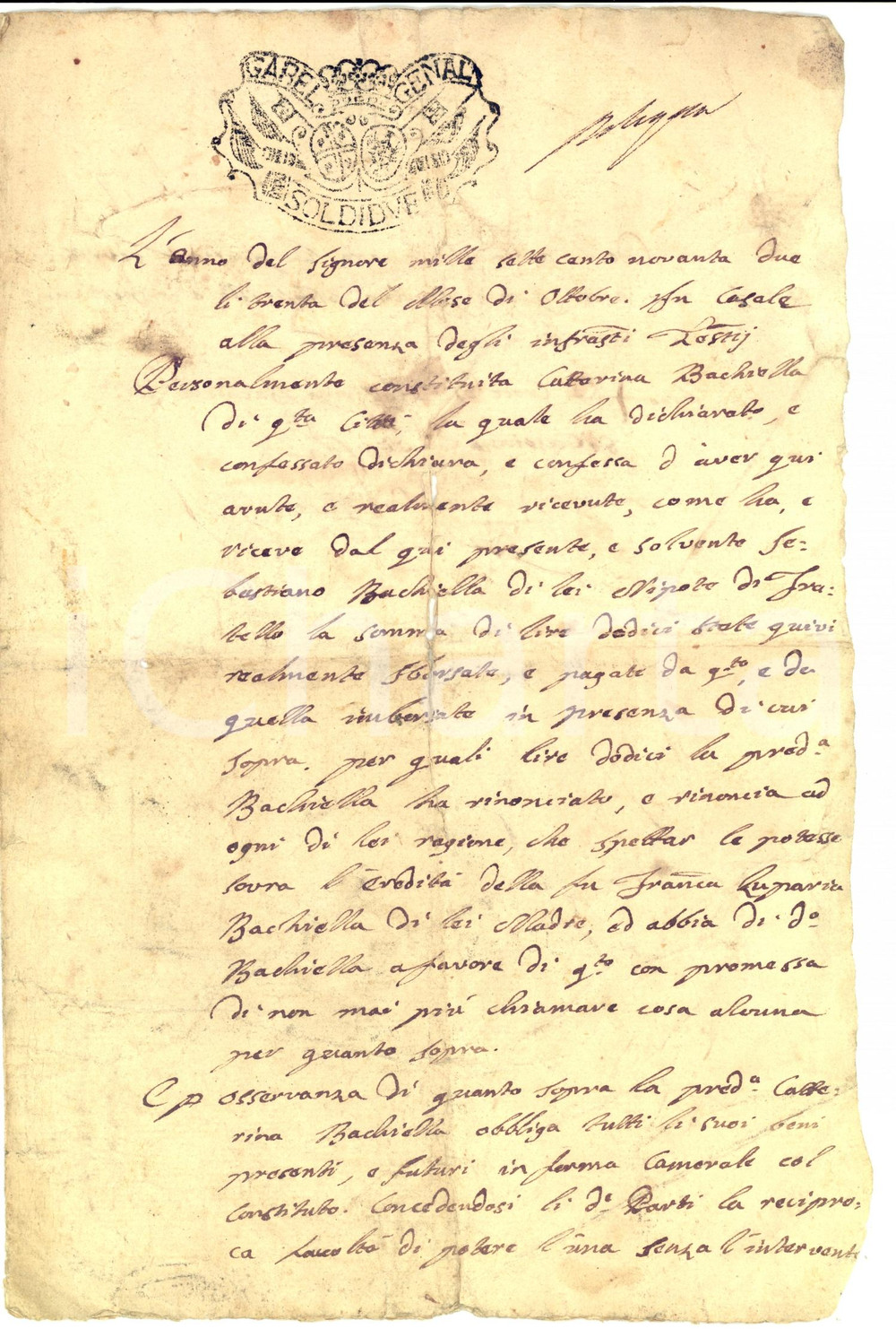 Documento di quietanza relativo al versamento effettuato da Sebastiano Bacchiella in favore della zia Caterina, che rinuncia pertanto a tutti i diritti sul patrimonio della defunta madre (e nonna del Bacchiella):