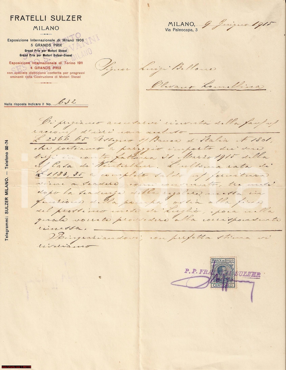TITOLO: FRATELLI SULZER - MOTORI DIESEL DESCRIZIONE: Lettera commerciale, inviata dalla ditta di Milano, specializzata in motori Diesel e pompe, al cliente Luigi Bellone. CONDIZIONI: buone (ma piegature d'epoca)