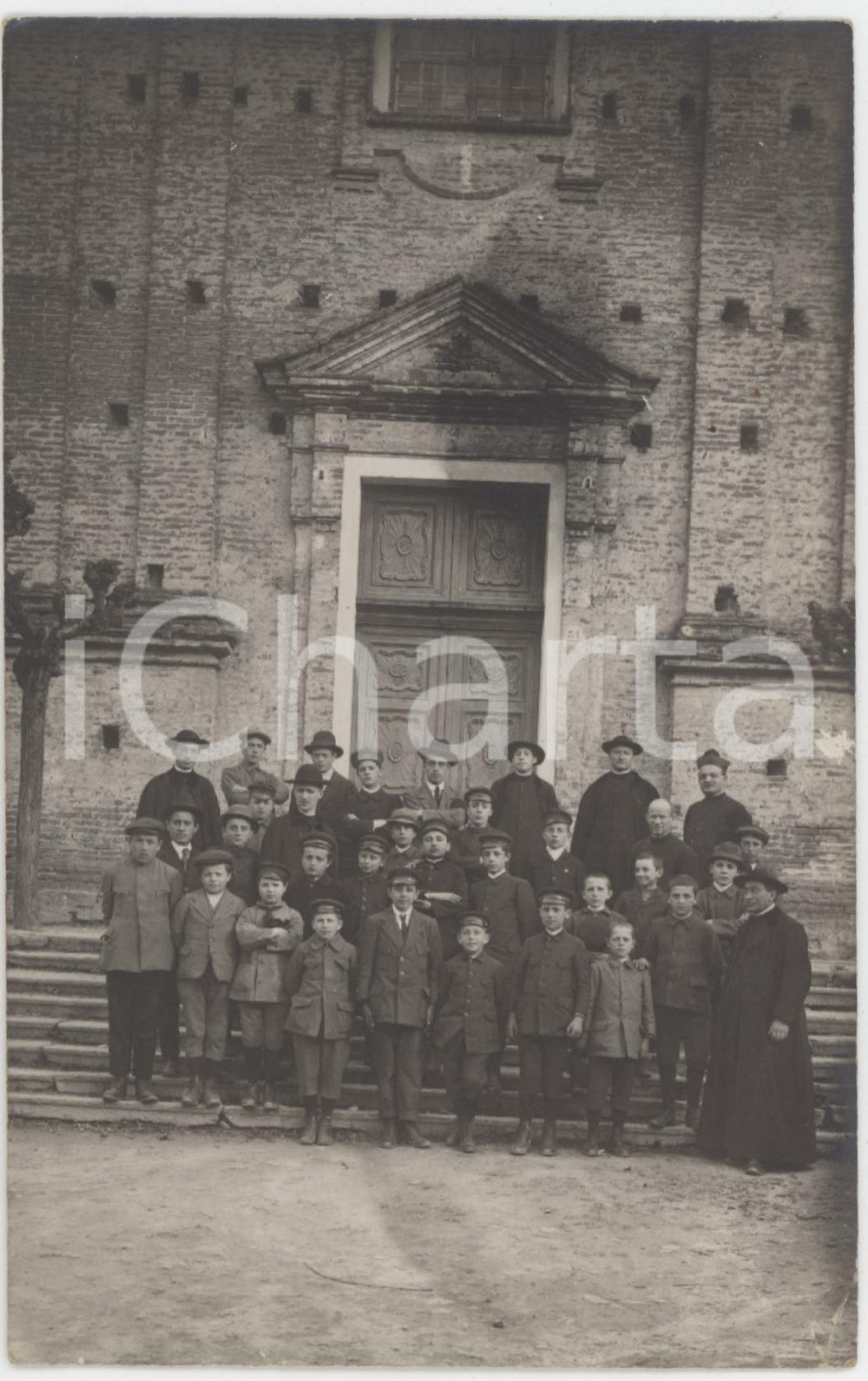 1920 ca ITALIA Bambini e sacerdoti davanti a una chiesa - Ritratto *Foto anonima