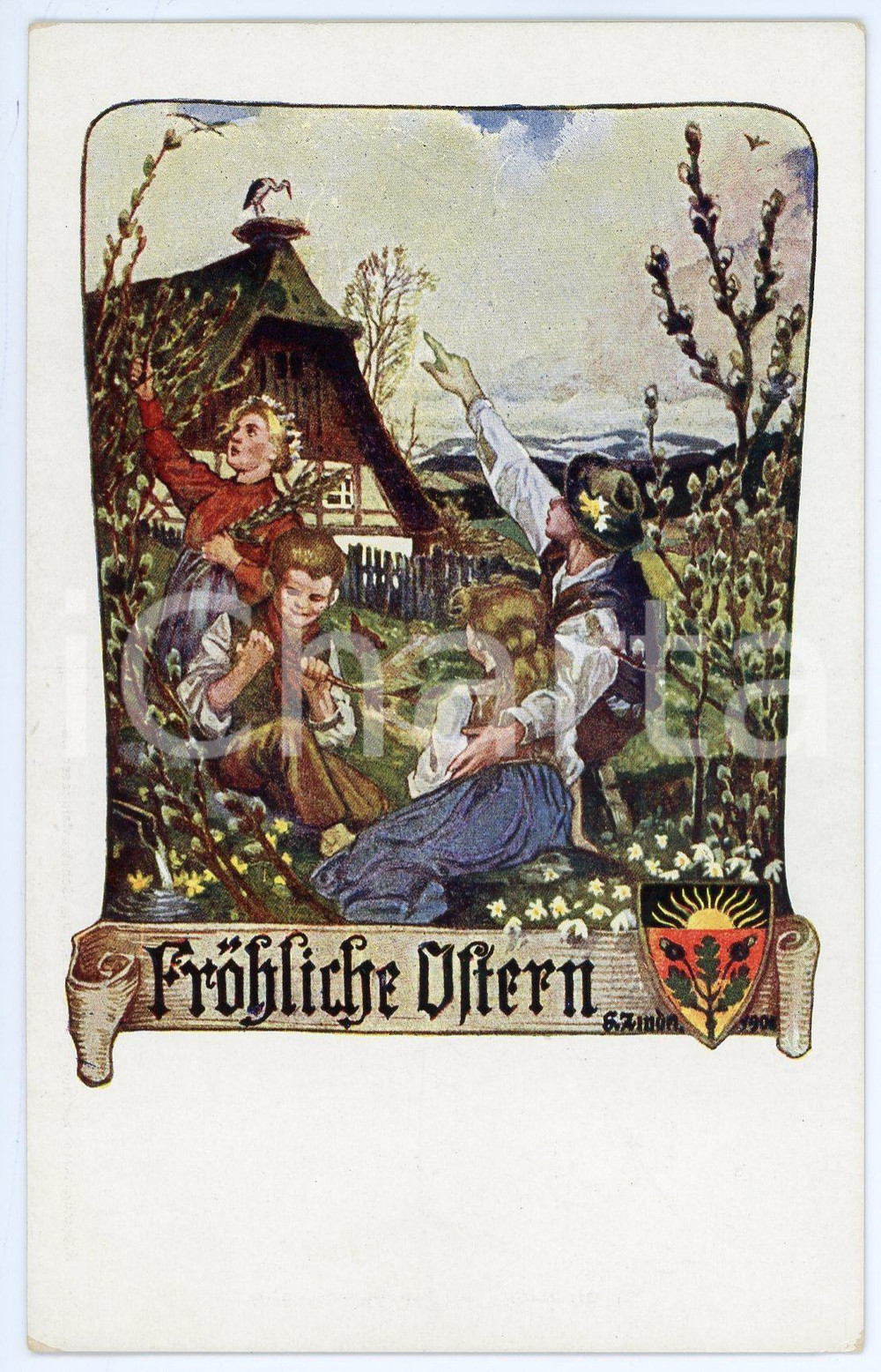 1925 ca FROHLICHE OSTERN Family - Stork - Deutscher Schulverein - Postcard