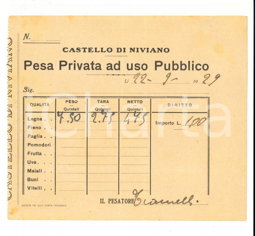 1929 NIVIANO CASTELLO (PC) Pesa privata ad uso pubblico