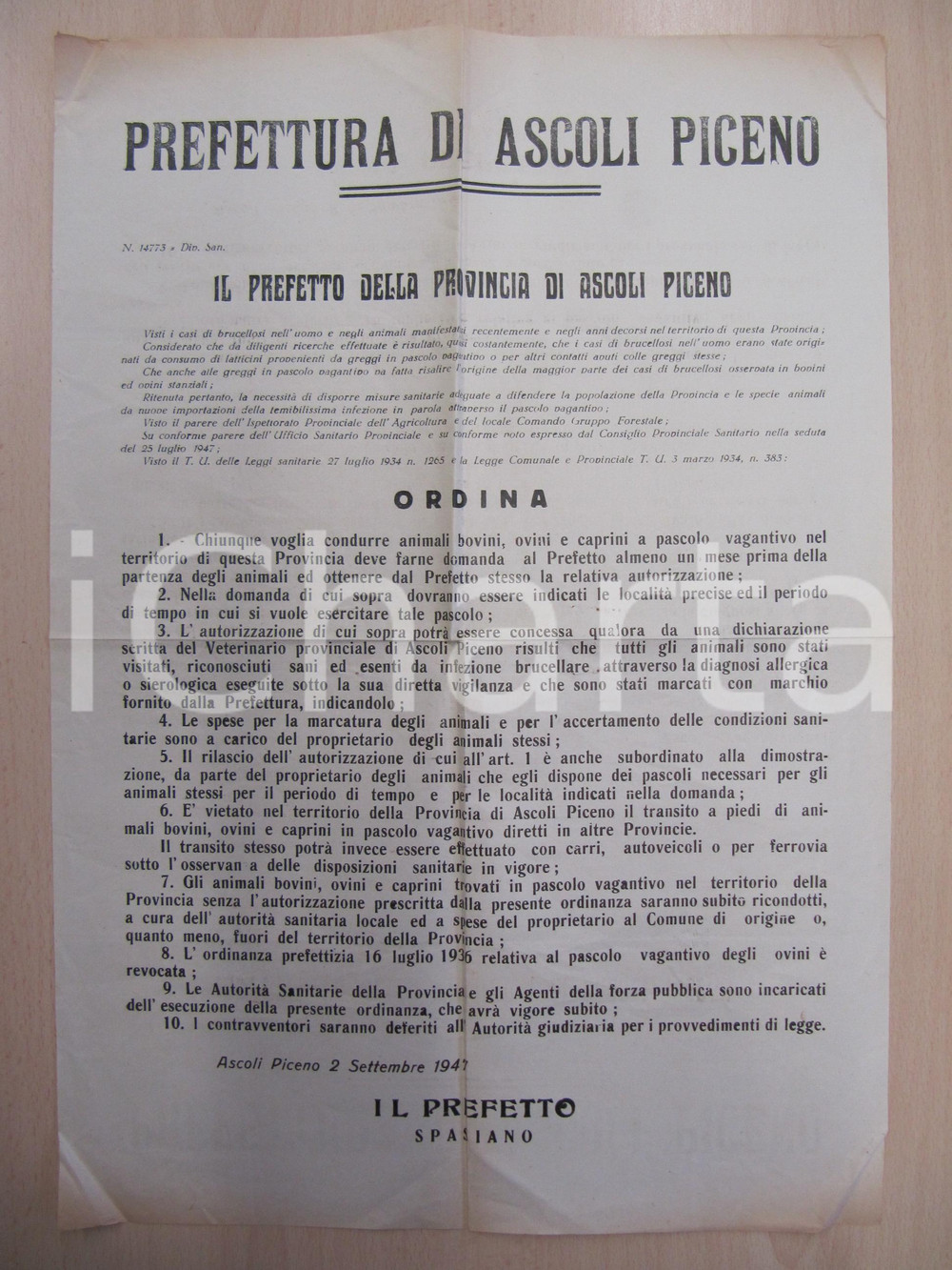 "... è risultato quasi costantemente, che i casi di brucellosi nell'uomo erano stati originati da cosnumo di latticini provenienti da greggi in pascolo vagantivo... E' vietato nel territorio della Provincia di Ascoli Piceno il transito a piedi di animali bovini, ovini e caprini in pascolo vagantivo... saranno subito ricondotti... fuori del territorio della Provincia...".
