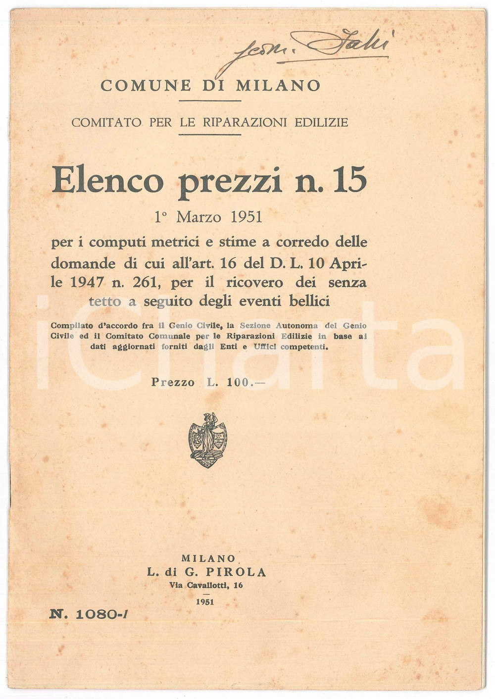 Pubblicazione originale d'epoca, a cura del Comitato per le Riparazioni Edilizie, relative ai computi e stime per il ricovero dei senzatetto per causa di guerra.